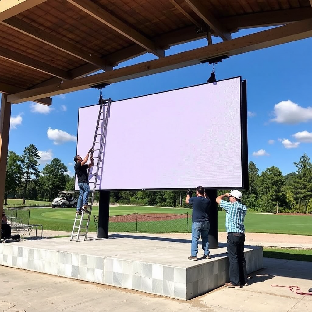Wir liefern und installieren hochauflösende, sonnenlichttaugliche Displays, die speziell für die Bedingungen auf dem Golfplatz entwickelt wurden, inklusive sicherer Verankerung und professioneller Anbindung.